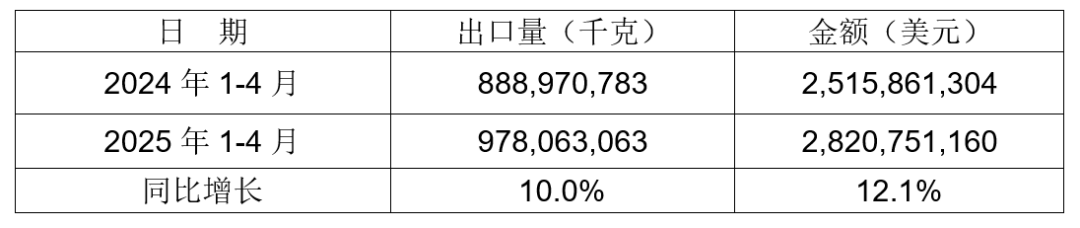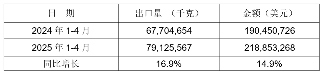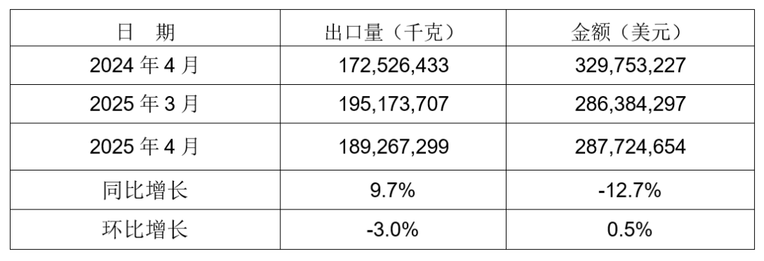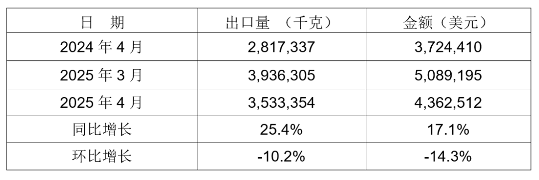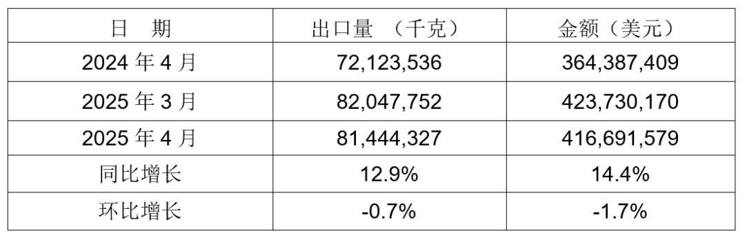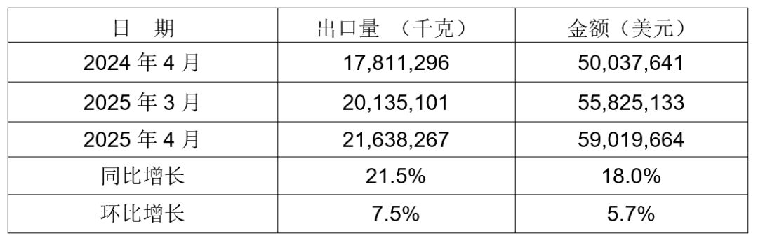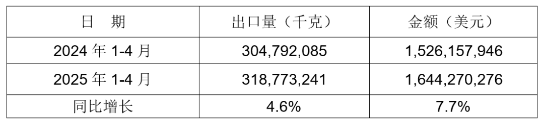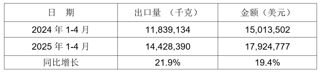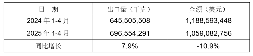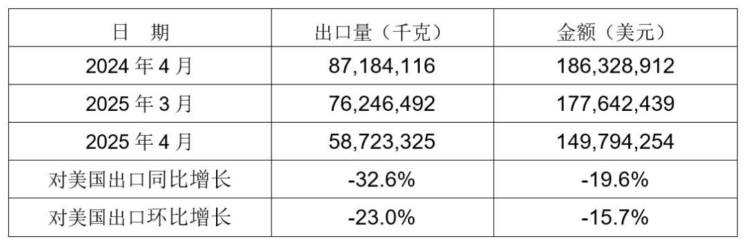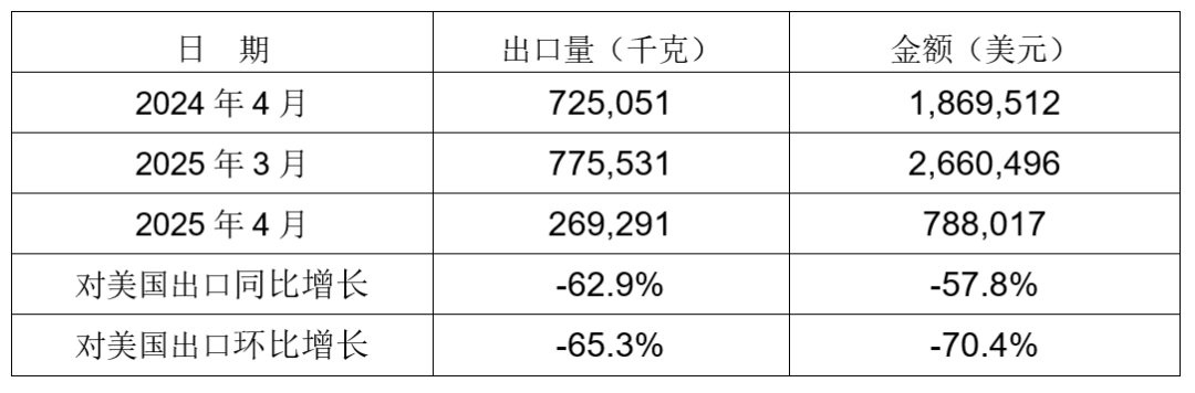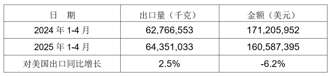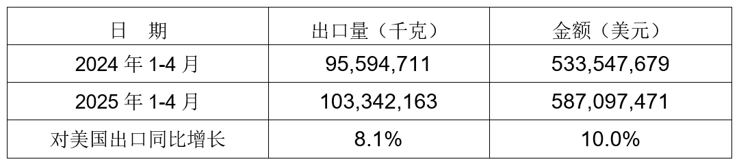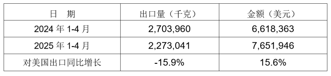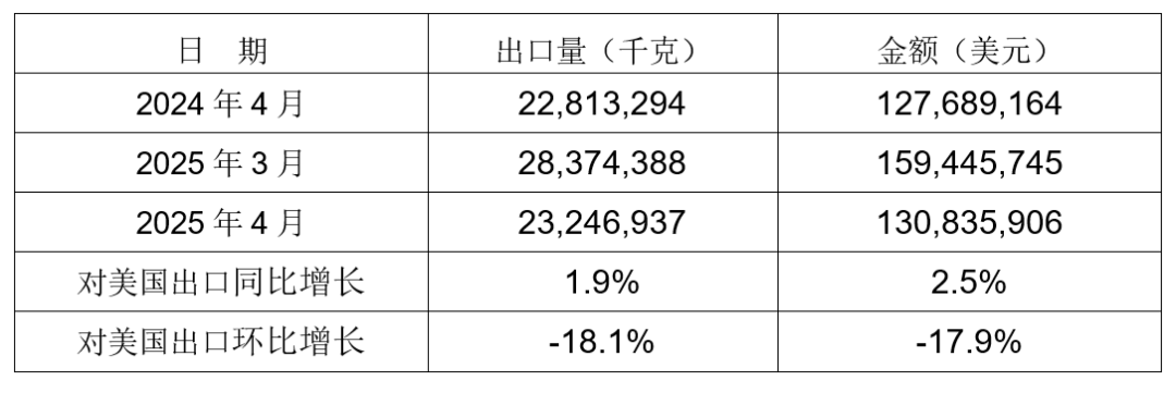 其中4月份,20个税则号共计出口56.7万吨,同比增长13.4%,环比增长5.6%,对美国出口9.7万吨,同比下降24.9%,环比下降12.9%;出口金额15.6亿美元,同比增长11.8%,环比增长6.7%,对美国出口金额3.2亿美元,同比下降20.9%,环比下降17.0%。