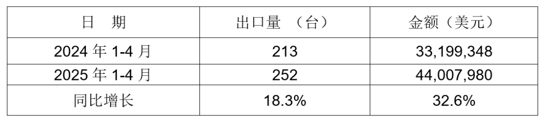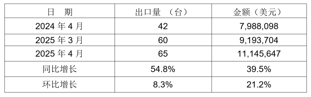 1-4月冷室压铸机共计出口252台,同比增长18.3%。其中:4月份出口65台,同比增长54.8%,环比增长8.3%,见表19和表20。