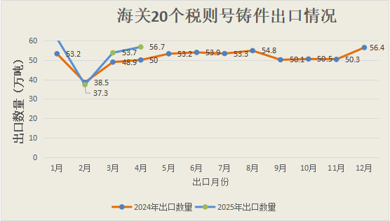 根据海关数据统计,2025年1-4月我国铸件出口数量同比增长,20个税则号出口总量207.2万吨,同比增长8.7%,对美国出口46.3万吨,同比下降6.0%,出口总额57.4亿美元,同比增长5.9%,对美国出口金额14.4亿美元,同比增长0.5%。