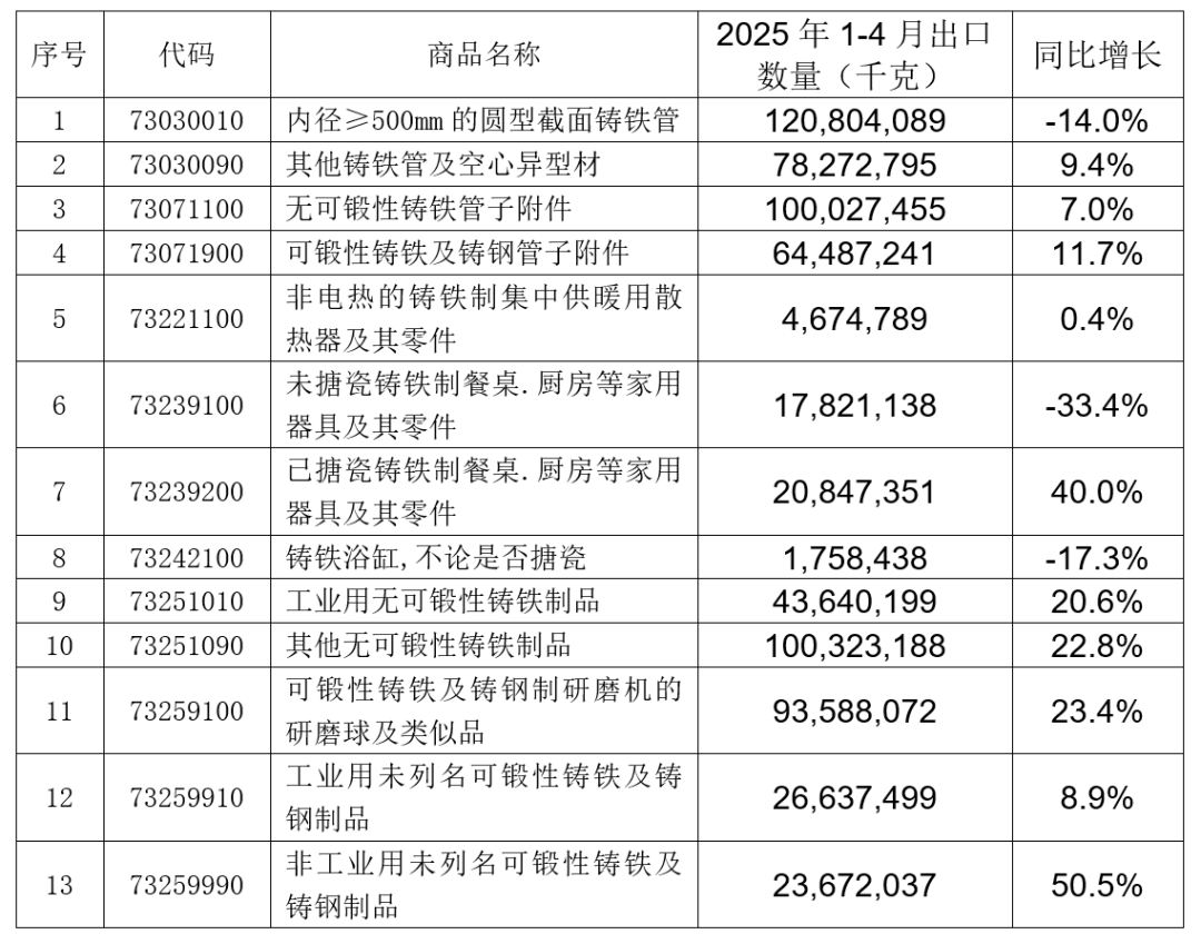 表 4:2025年4月黑色铸件同比、环比出口情况